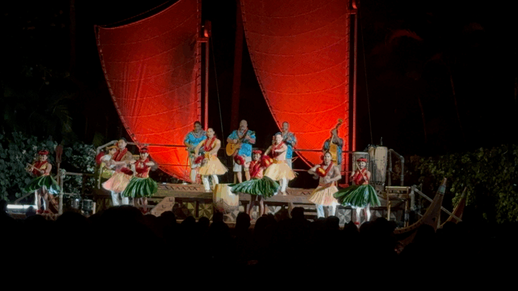 This wasn’t some two-song hula sideshow. It was a full three-hour cultural celebration, with interactive stations before the show (ukulele lessons, faux tattoos, flower bracelets, and more), an open-air buffet dinner, and a gorgeous stage show complete with lights, music, and heartfelt storytelling.