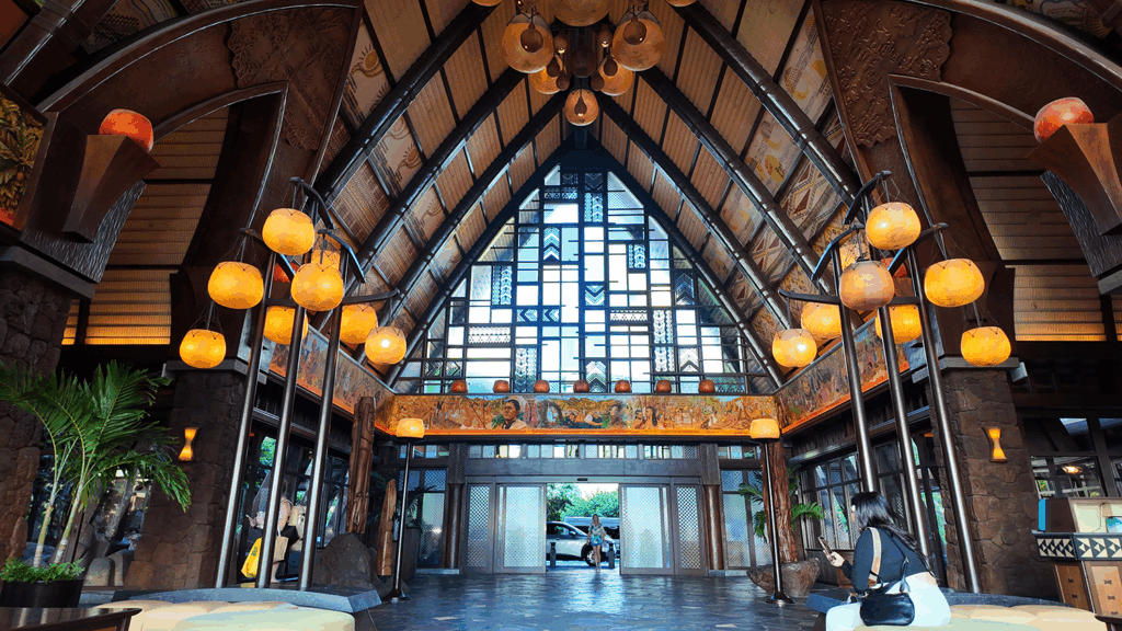 If you’ve ever stayed at Disney’s Animal Kingdom Lodge, the open-air feel might seem familiar—but Aulani takes it up a notch. The lobby is adorned with stunning Hawaiian art, wood carvings, and cultural storytelling everywhere you turn. You walk in, look out the back balcony, and see the entire resort curve around you in a perfect U-shape, wrapping around koi ponds, lush gardens, pools, and that incredible beach lagoon.