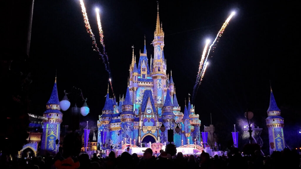 A Frozen themed castle show that lights up Cinderella Castle in wintery projections. It feels extra perfect if the weather is actually chilly like it was for us. - Complimentary cookies and drinks all over the park