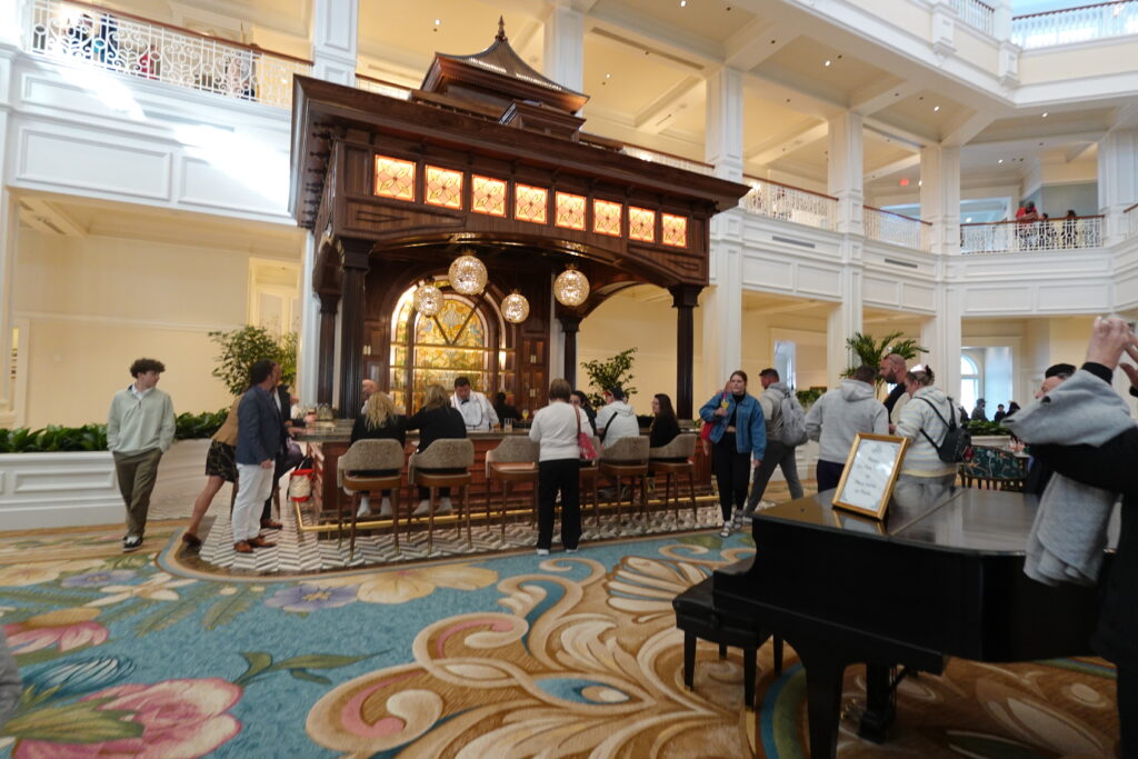 We started our party night in full cozy mode at Disney’s Grand Floridian Resort. The lobby remodel looks fresh and bright, and we popped into the new lobby bar first to check it out. It has a small, focused drink menu with fun options like the Grand Floridian 75 and a strong rum cocktail that is very much a one and done situation.