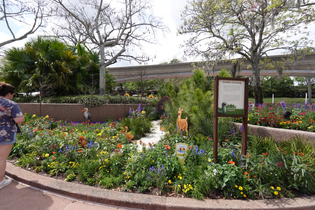 The Hoppers Inspired Wildlife Crossing Garden is a standout addition, tucked inside the flowerbeds at Connections Café. Tied to the upcoming Pixar film Hoppers, the garden celebrates the real world concept of wildlife crossings, which are man made corridors that help animals safely navigate urban environments. It’s educational, beautifully planted, and even features a special stake honoring Pixar’s 40th anniversary.